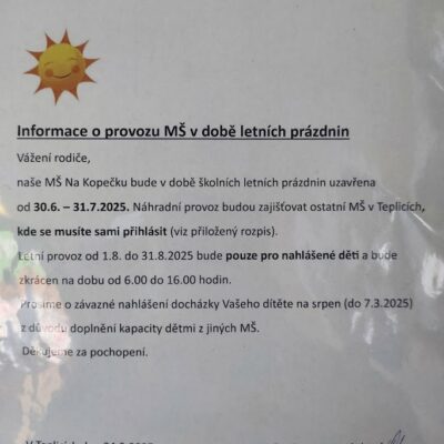 naše MŠ Na Kopečku bude v době školních letních prázdnin uzavřena od 30.6. do 31.7. 2025. Náhradní provoz budou zajišťovat ostatní MŠ v Teplicích, kde se musíte sami přihlásit. Letní provoz od 1.8. do 31.8. 2025 bude pouze pro nahlášené děti a bude zkrácen na dobu od 6.00 do 16.00 hodin. Prosíme o závazné nahlášení docházky Vašeho dítěte na srpen (do 7.3. 2025) z důvodu doplnění kapacity dětmi z jiných MŠ. Děkujeme za pochopení.