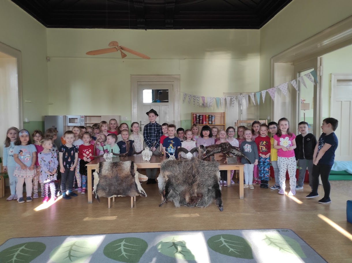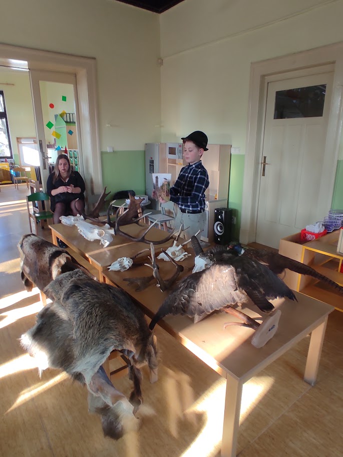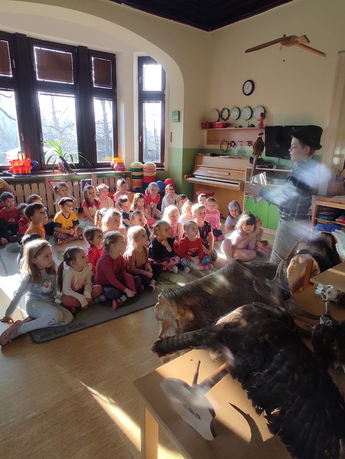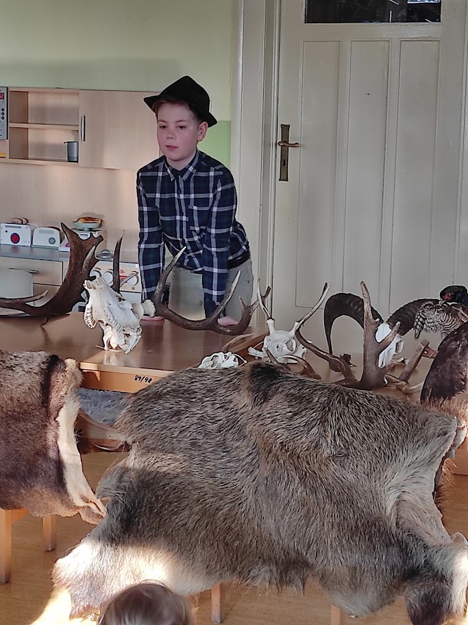Dnešní přednáška ve školce 7.3. 2025 byla opravdu výjimečným zážitkem! Malý myslivec Eliáš Drenčko (11 let) nás všechny ohromil nejen svými znalostmi o přírodě, ale také svým vystupováním. Mluvil s takovou jistotou a nadšením, že zaujal nejen děti, ale i dospělé. Přinesl s sebou na ukázku paroží, kůži i vycpané ptáky, což dětem umožnilo vidět a dokonce i osahat si věci, které jinak znají jen z obrázků. Díky jeho poutavému vyprávění se dozvěděly spoustu zajímavostí o lese a jeho obyvatelích.